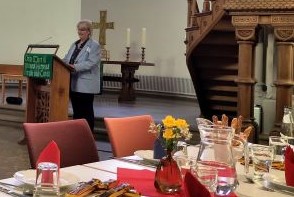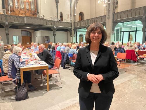 Vor dem Hauptgang kam die eigens aus Warschau angereiste Direktorin der Diakonie der Evangelisch Augsburgischen Kirche in Polen zu Wort. Wanda Falk berichtete, dass 2,5 der 37,5 Millionen Einwohner Polens im Ausland leben, um den Lebensunterhalt für ihre Familien zu sichern, darunter viele Frauen, die als Hilfs- oder Fachkräfte in der Pflege arbeiten. Sie lenkte den Blick auf die Kinder, die in der Obhut von Großeltern und Verwandten zurückgelassen werden. Viele kommen dadurch an ihre Grenzen, körperlich und seelisch. Wanda Falk wollte kein schlechtes Gewissen machen, dass im Westen osteuropäische Arbeitskraft genutzt wird. Vielmehr weist sie auf das weitgehend unbekannte Phänomen der Eurowaisen hin. Die Kinder entwickeln oft psychische Probleme. Hier versucht die Diakonie mit psychosozialer Beratung und Unterstützung zu helfen. Das Gustav-Adolf-Werk unterstützt mit Spenden. „Gemeinsam schaffen wir das!“ So beendete Wanda Falk zuversichtlich ihren Beitrag.