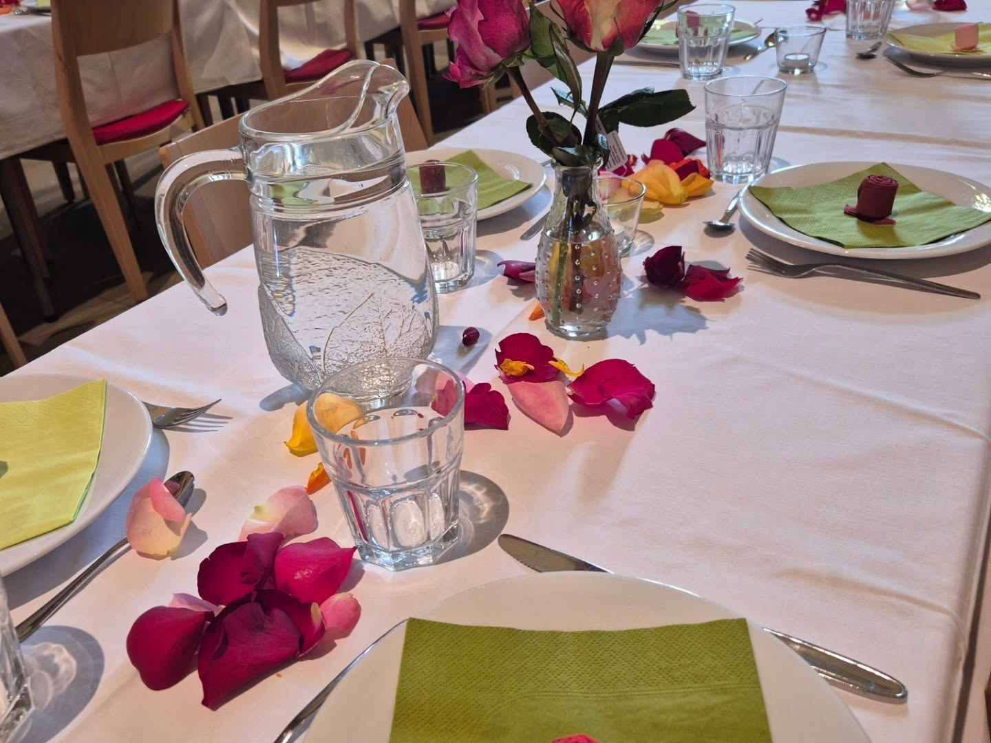 Bild 1: Für den Tischschmuck aus - selbstverständlich fair gehandelten - echten und Servietten-Rosen sowie den Rosenaperitiv zu Beginn hatte die Gleichstellungsbeauftragte des Kirchenkreises gesorgt.