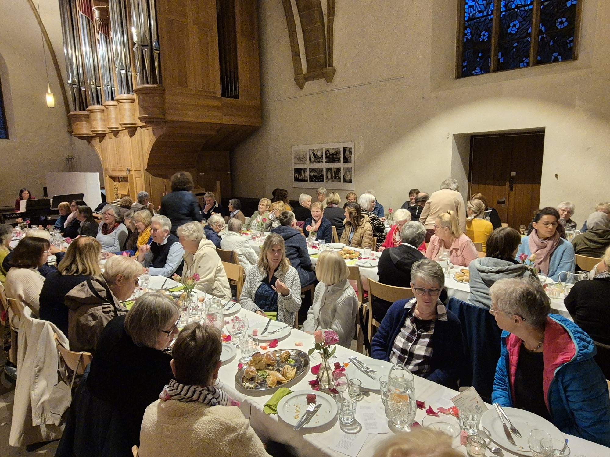 Die Frauenarbeit des Gustav-Adolf-Werks Westfalen und die Evangelische Lydia-Kirchengemeinde in Bielefeld luden darum am 13. September in die Johanniskirche zu einem Frauenmahl ein, unterstützt von der Erwachsenenbildung des Kirchenkreises. Viele Menschen aus der Gemeinde sorgten für eine gastfreundliche Atmosphäre – auch das ist Care-Arbeit! Rund 60 Frauen folgten der Einladung, ließen sich mit einem leckeren vegetarischen Essen (Care: Fürsorge für Umwelt und Klima!) verwöhnen, lauschten festlicher Tafelmusik und kamen durch drei Impulsreferate in gute Gespräche bei Tisch.
