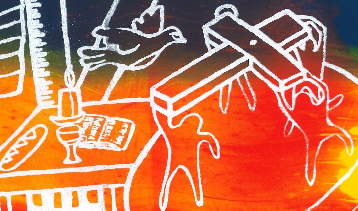Das Ökumenische Sozialwerk des Barrio Borro unterhält seit Jahrzehnten ein Tageszentrum in diesem bescheidenen Viertel am Rande der uruguayischen Hauptstadt Montevideo, in dem Arbeiterfamilien leben. Im Tageszentrum werden vor allem Kinder und Jugendliche in ihrer Entwicklung begleitet mit sozialen, pädagogischen, sportlichen und musikalischen Angeboten. In einem Kunstworkshop hat ein Jugendlicher einige der Aktivitäten auf einem Plakat dargestellt: die handwerklichen Workshops, die Percussion-Workshops und die religiösen Feiern. Letzteres zeigt unser Lesezeichen. Es ist ein Ausschnitt aus diesem Plakat.