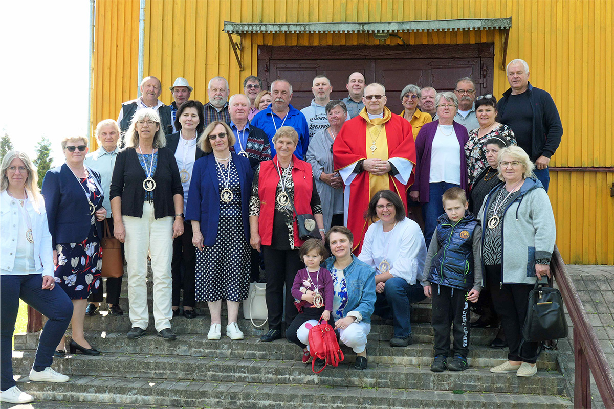 Die kleine Gemeinde mit Pfarrer Edikas Šulcas vor der Holzkirche in Skaudvile