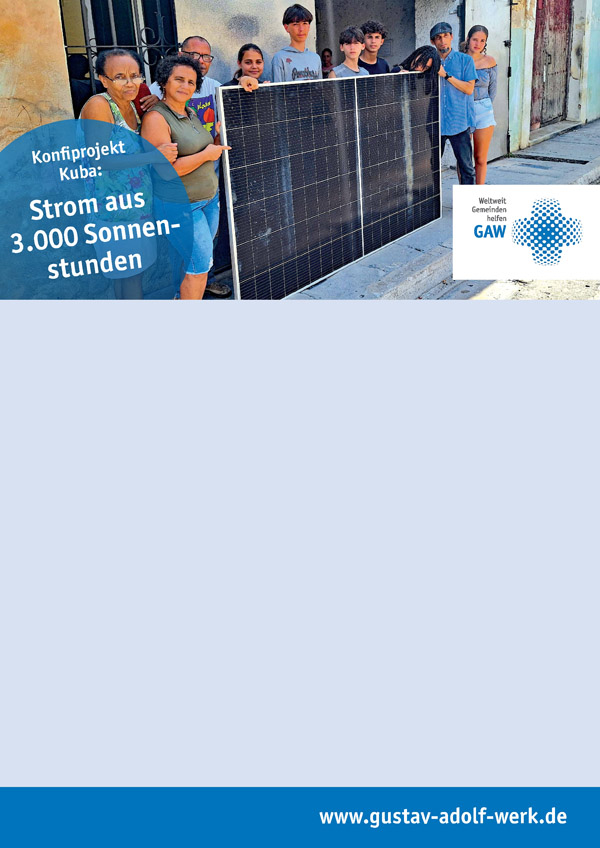 Eine Lösung wäre Solarstrom. Die Sonne scheint in Kuba rund 3 000 Stunden im Jahr. Mit dem Projekt „Strom aus 3 000 Sonnenstunden“ möchten wir Solaranlagen auf Kirchendächern in Kuba installieren. Das bedeutet: Gottesdienste, Jugendarbeit und soziale Hilfsangebote können stattfinden!