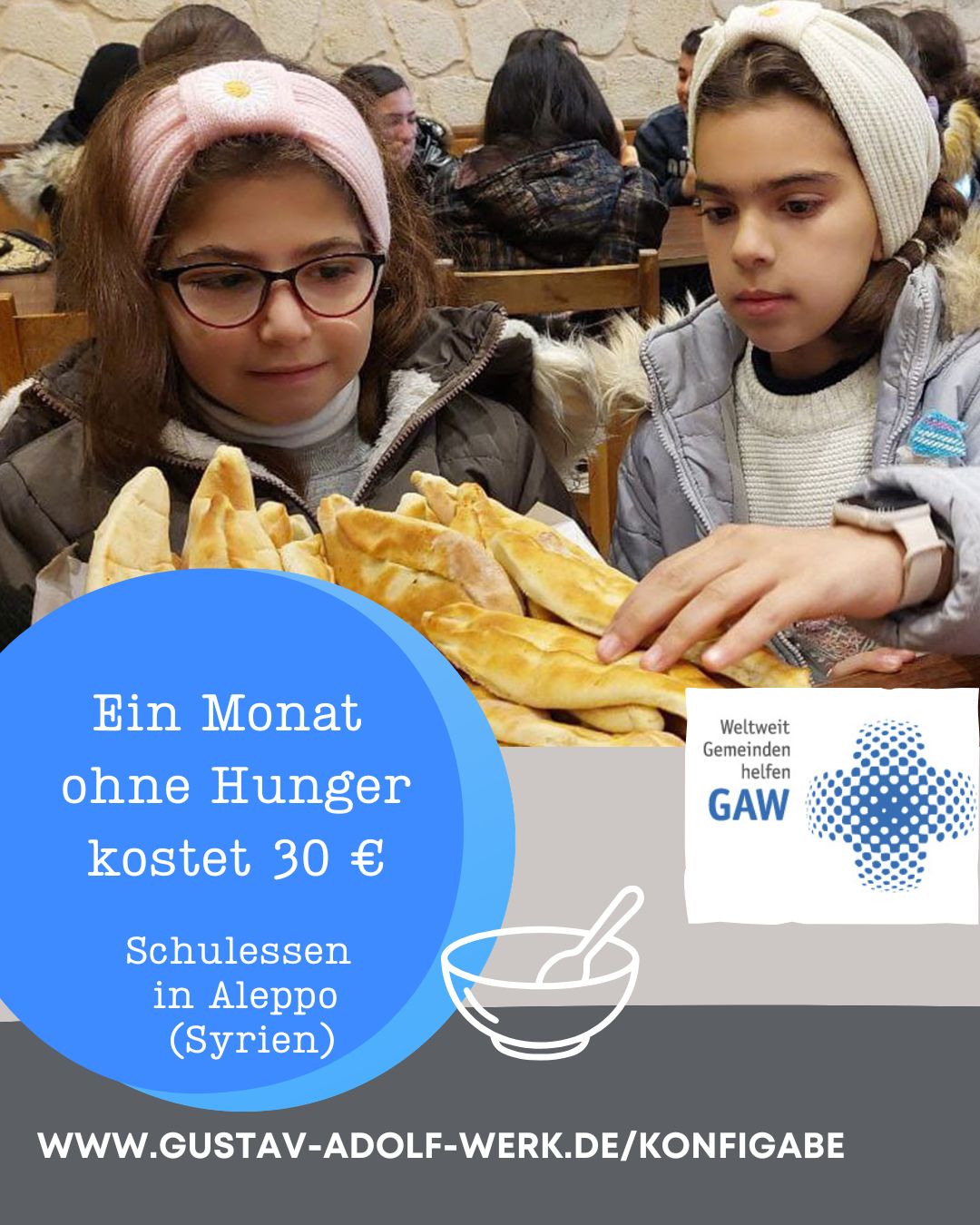 Kleiner Beitrag – große Wirkung: Mit 30 Euro schenkst du einem Kind in Aleppo für einen Monat Schulessen.
