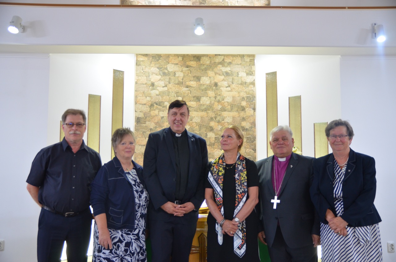 V.l.: Alexander Schacht (Aussiedlerseelsorge Kirchenkreis Hanau), Inge Ruehl (GAW), Pfr. Armin Beck (Dezernat Diakonie und Ökumene/Ausbildungshilfe-Christian Education Fund), die deutsche Botschafterin in Kirgisistan, Dr. Gabriela Guellil (Deutsche Botschafterin in Bischkek), Bischof Alfred Eichholz (Evangelisch-Lutherische Kirche Kirgisiens, Ulrike Combé-von Nathusius (GAW). (Foto: Ökumene-Dezernat EKKW)
