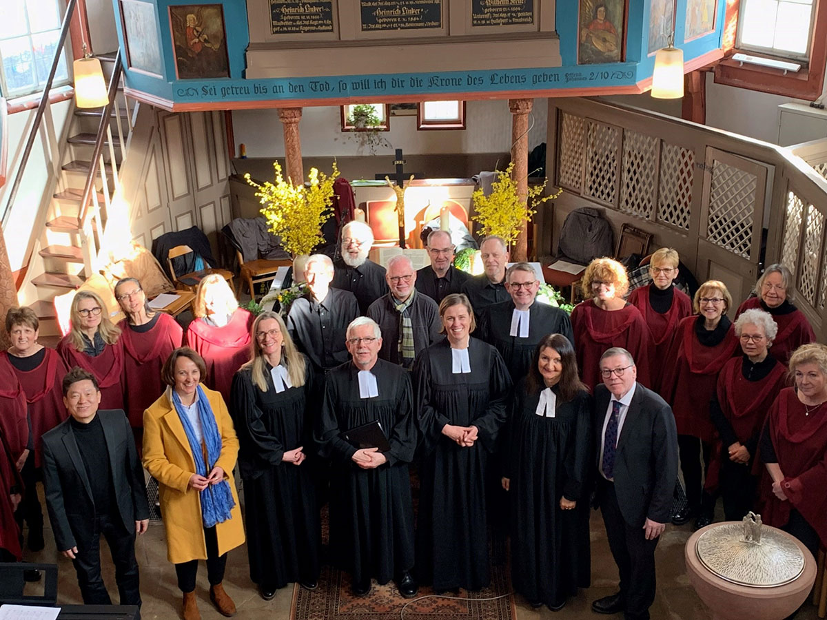 Mitwirkende im Gottesdienst, vordere Reihe v.l.: Kantor Kiwon Lee, Dekanin Birgit Hamrich, Pfarrerin Christina Schnepel, Pfarrer Frank Eckhardt, Pröpstin Henriette Crüwell, dahinter Propst Dr. Volker Mantey, davor OLKRin Claudia Brinkmann-Weiß und OKR Detlev Knoche