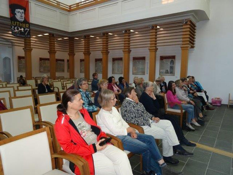Eine weitere Station ist die evangelische Gemeinde in Krizevci in der Prekmurje. Pfarrer Mitja Andrejek empfängt die Reisegruppe aus Kurhessen-Waldeck in der großen Kirche. Im Gemeinde-haus laden Frauen der Gemeinde zu regionalen Spezialitäten auf festlich gedeckten Tischen ein. Auch hier ist gelebte Gastfreundschaft spürbar. Im Gespräch mit Pfarrer Mitja Andrejek erfahren wir: ein Jahr war Mitja Andrejek Stipendiat des GAW in Leipzig, dort konnte er an der Universität theo-logische Studien fortsetzen und die Möglichkeit nutzen, evangelische Gemeinden in Deutschland kennenzulernen. Seit 2016 betreut Pfarrer Andrejek die 900 Gemeindeglieder der Gemeinde, die auf 16 Dörfer verteilt sind. Über ihn laufen die Kontakte zur Evangelischen Humanitären Organisation (EHO) Podpornica, sozusagen dem Diakonischen Werk der evangelischen Kirche Sloweniens. Die EHO Podpornica hilft Senioren, Kindern und Jugendlichen und allen, die praktische oder finanzielle Unterstützung brauchen. Mitja Andrejek vermittelt den kostenlosen Verleih von Pflegebetten oder „Essen auf Rädern". Die Pflegebetten waren zuvor in deutschen Krankenhäusern oder Sozialstationen im Einsatz. Die Frauenarbeit im GAW unterstützt den Transport, sowie Instandsetzung, Lagerung und Verteilung finanziell. Welch große Hilfe der Einsatz von Pflegebetten für Patienten und Pflegende – in der Mehrzahl Frauen – bedeutet, schildert der junge Gemeindepfarrer.