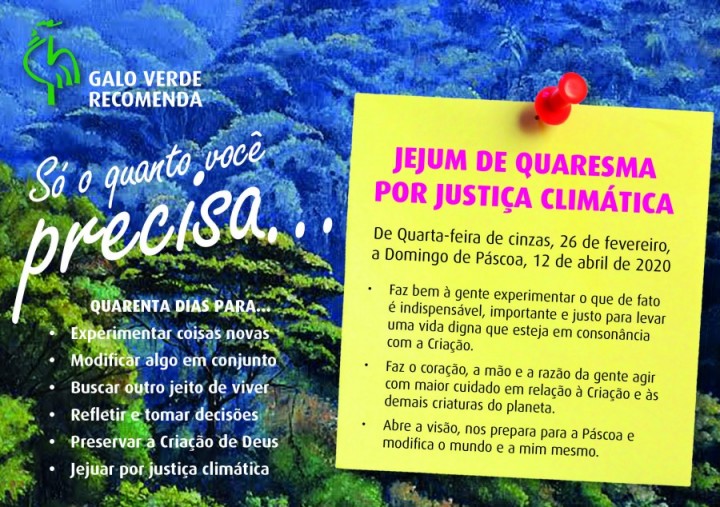 Die globale Erwärmung mit den schwerwiegenden Folgen des Klimawandels auf unserem Planeten fordern uns alle heraus, etwas zu tun. Wissenschaftler warnen seit Jahren und fordern zu massiven Anstrengungen heraus. Das geht nur über Verzicht und eine andere Einstellung zur Art wie wir leben. Kirchen weltweit schließen sich den Forderungen nach Veränderungen an und versuchen selbst aktiv zu werden. Als Kirchen sind wir gefordert eine "Ethik des Genug" mit Leben zu füllen. In der Fastenzeit schlägt deshalb die EKLBB ihre Mitglieder und die gesamte brasilianische Bevölkerung vor, praktische Arten der Ausübung einer solchen Ethik auszuprobieren. Die Idee besteht darin, dass alle Menschen genug haben, um in Würde zu leben. Ziel ist es, dass alle über das richtige Maß ihres Konsums nachdenken und die Schöpfung bewahren.