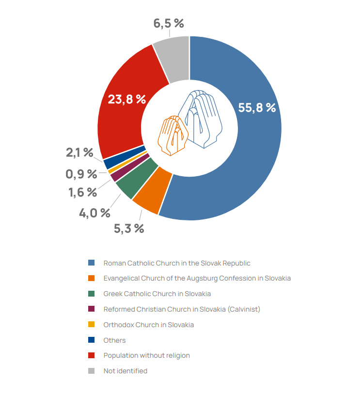 Mit drei Millionen bekennt sich weiterhin der größte Teil der slowakischen Bevölkerung zur römisch-katholischen Religion, deren Anteil ist jedoch im Vergleich zu 2011 von 62,0 % auf 55,8 % zurückgegangen.