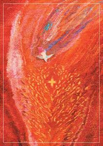 „Rot ist die Farbe der Farben. Als Motiv schlug Pfarrer Jaan Tammsalu den brennenden Dornbusch vor. Interessanterweise hatte ich im Jahr 1989 schon einen Teppich mit einem Weidenbusch auf einem Flammenhintergrund gemacht. So war dieses Motiv mir schon einmal in meinen Werken begegnet. Dazu sollte noch der Heilige Geist als eine kleine weiße Taube kommen. Ich habe versucht, der Taube eine ätherische Gestalt zu geben, etwas luftiges, wie ein Windhauch. Aber der Hauch ist einer, der dir Hoffnung und Freude gibt und deine Gedanken reinigt. Und diese Taube hat keine Angst vor Feuer. Als ich den Altarteppich webte, war es körperlich schwer für mich. Es ist nicht nur geistige Arbeit und Fingerfertigkeit, sondern eine starke innere Spannung wie bei einem Sportler. Manchmal kann Schweiß in Strömen fließen. Ich fühlte mich, als hätte ich das Feuer selbst gewebt." (Textilkünstlerin Tiina Puhkan)