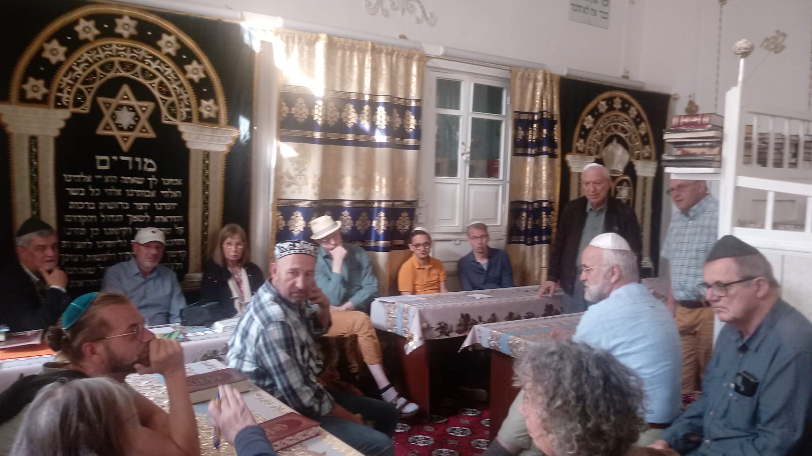 Seit dem 6. Jahrhundert leben Juden in Buchara. In Hoch-Zeiten bis zu 23000, jetzt etwa 200. Rabbiner Abram Ischakov erklärt, zum samstäglichen Gottesdienst kämen zwischen 20 und 30 Gemeindeglieder, darunter auch Jugendliche. Auf dem nahen jüdischen Friedhof liegen sephardische und aschkenasische Verstorbene in verschiedenen Bezirken. Foto: in der Synagoge in Buchara